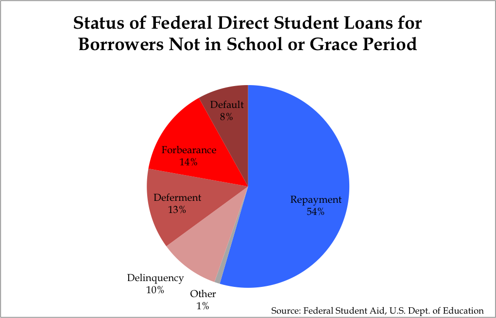 Excluding student loans owed by borrowers currently in school or in their six-month grace period, 46 percent of student loans are not currently being repaid. Ten percent of student loans are delinquent, meaning the borrower has missed payments for thirty days or more. Another 13 percent are in deferment, which means payments have been postponed for various reasons. Another 14 percent are in forbearance, meaning the borrower has encountered economic hardship and had their payments suspended or reduced.