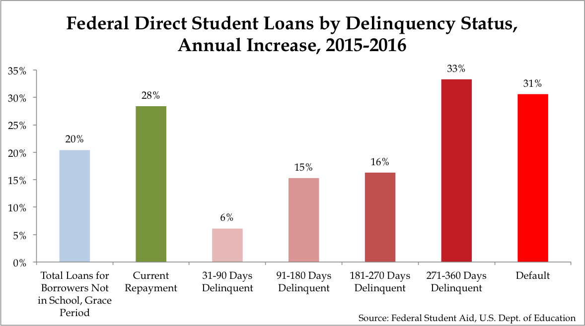 Unfortunately, the trend seems to be moving in the wrong direction. While delinquency rates dropped, overall loan nonperformance increased. Most notably, student loans in default (defined here as loans more than 360 days delinquent) increased 31 percent in the past year, to $56 billion. This far outpaced the 20 percent increase in the outstanding balance for all borrowers not in school or a grace period.