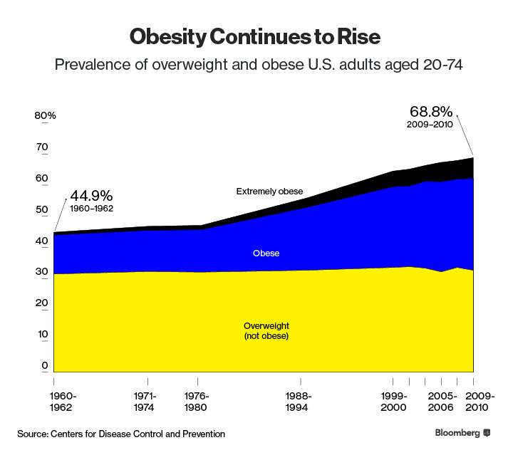 What’s interesting is that government data reveals this is almost precisely the same year America’s obesity rise began, as the Bloomberg chart below illustrates.