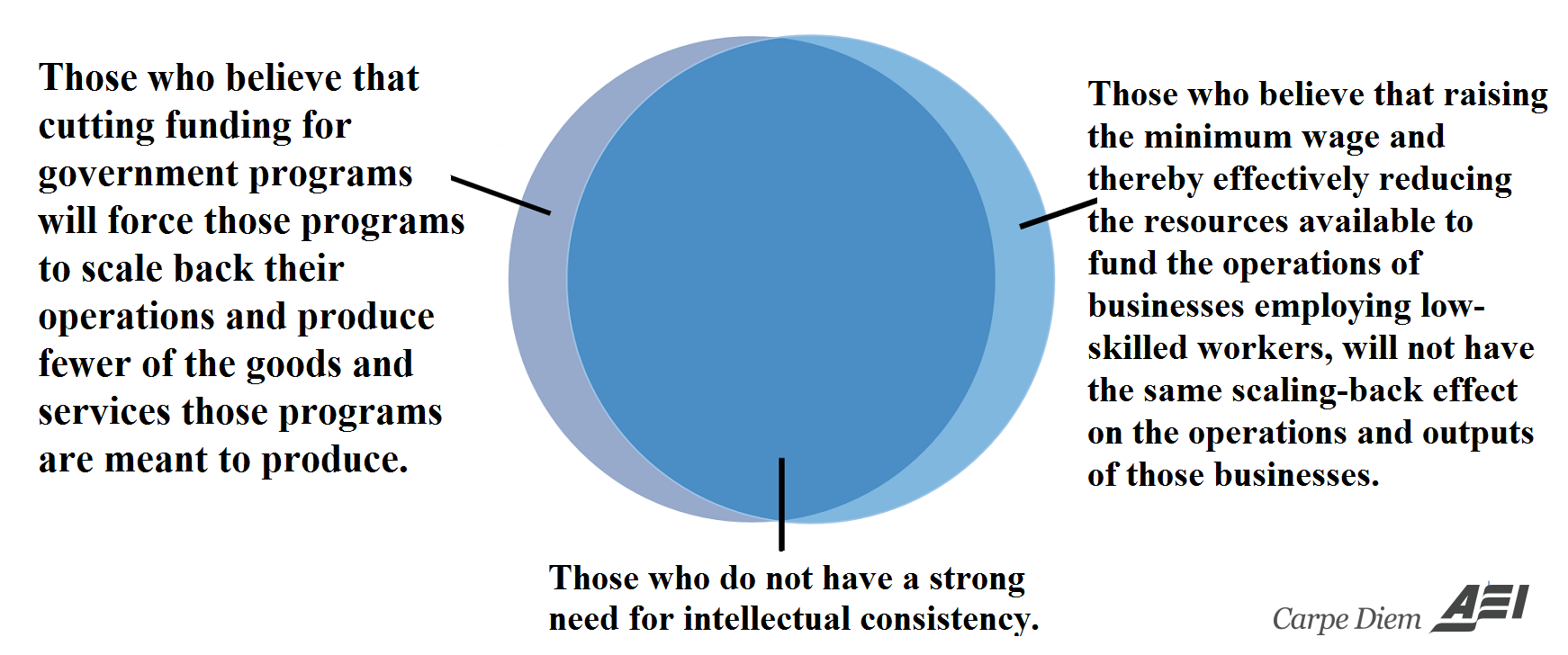 - Venn Diagram XI (above). Created in response to a question from Don Boudreaux: “If cutting the budget of a government program causes the operation of that program to shrink, why does not raising the minimum wage inevitably cause the operations of employers of low-skilled workers to shrink?” Good question.