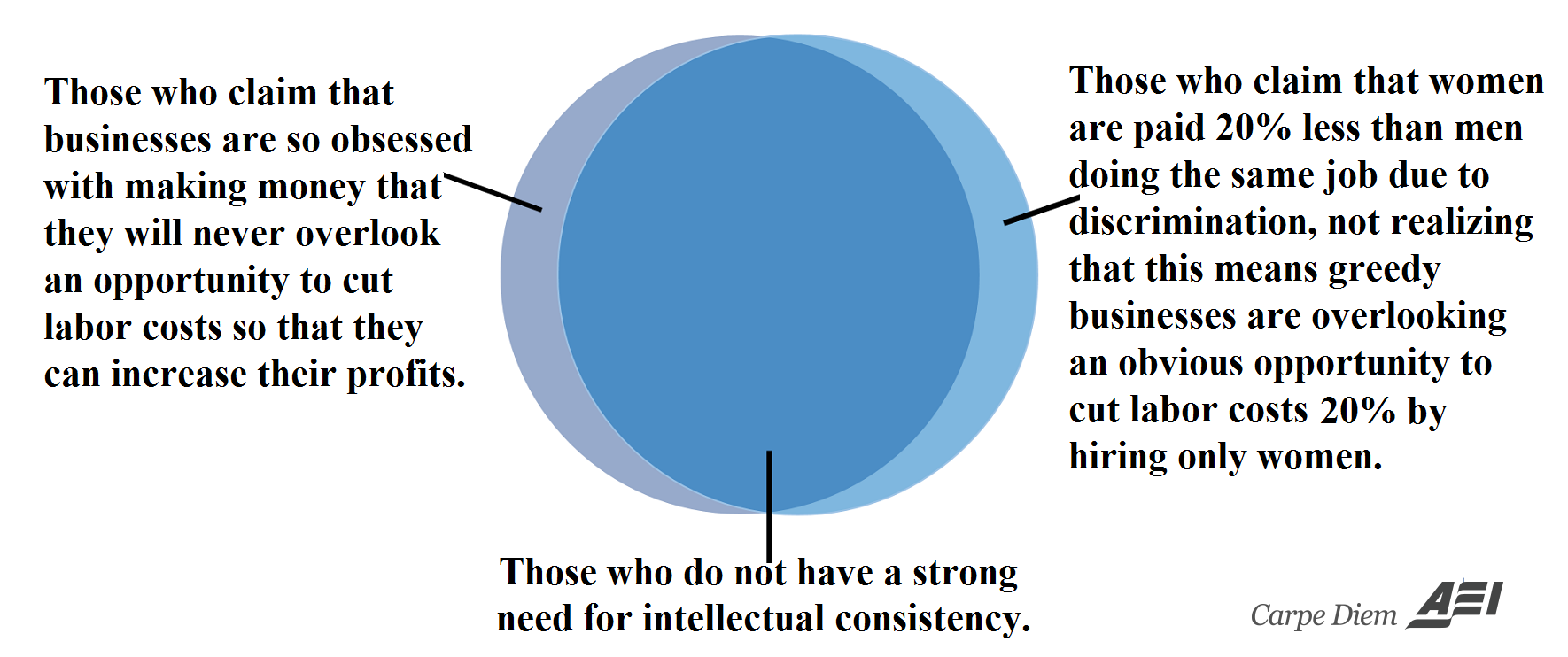 - Venn Diagram VI (above). If business cares about making as much money as possible, wouldn’t they hire only women if there was a 20% gender pay gap due to discrimination?