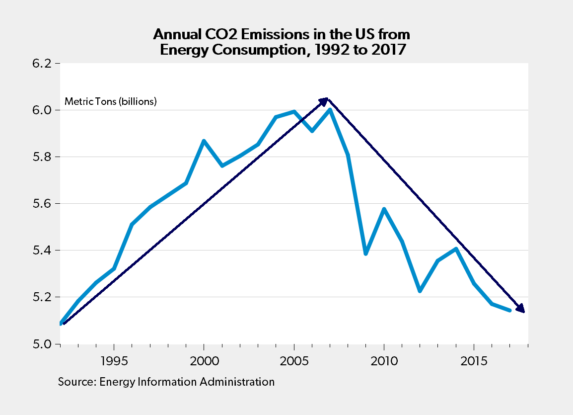 What you probably won’t hear about from the Earth Day supporters is the amazing “decarbonization” of the United States over the last decade or so, as the falling CO2 emissions in the chart above illustrate, even as CO2 emissions from energy consumption have been rising throughout most of the rest of the world. Energy-related carbon emissions in the US have been falling since the 2007 peak, and were at their lowest level last year in a quarter century, going back to 1992. And the environmentalists and the “Earth Day” movement really had very little to do with this amazing “greening” of America. Rather, it’s mostly because of hydraulic fracturing and the increasing substitution of natural gas for coal as a fuel source for electric power, see related CD post here.
