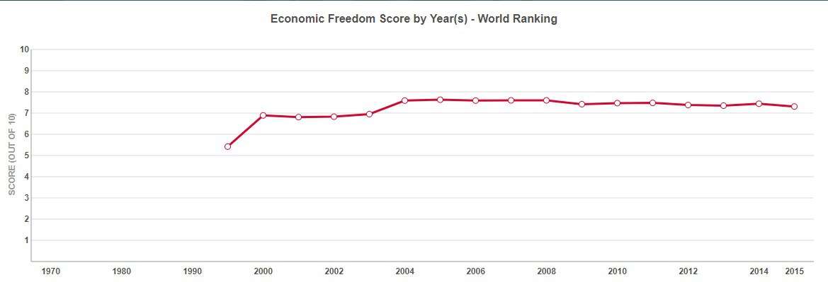 The nation’s strong rise and subsequent slippage can be seen in the data from Economic Freedom of the World.