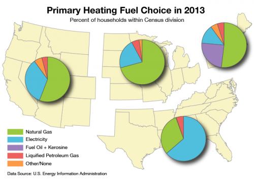 Most parts of the country, however, aren’t heated with electric power. Natural gas—a fossil fuel—is the primary fuel for warming homes in most parts of the country by a wide margin. Kerosene and fuel oil also account for a sizable portion in some parts of the country. On a continent of about 3.8 million square miles that sees temps reach as low as 13 degrees Fahrenheit in Atlanta and -4 degrees in New York City, fossil fuels are what fight the freeze, keeping hundreds of millions of Americans warm during the coldest months.