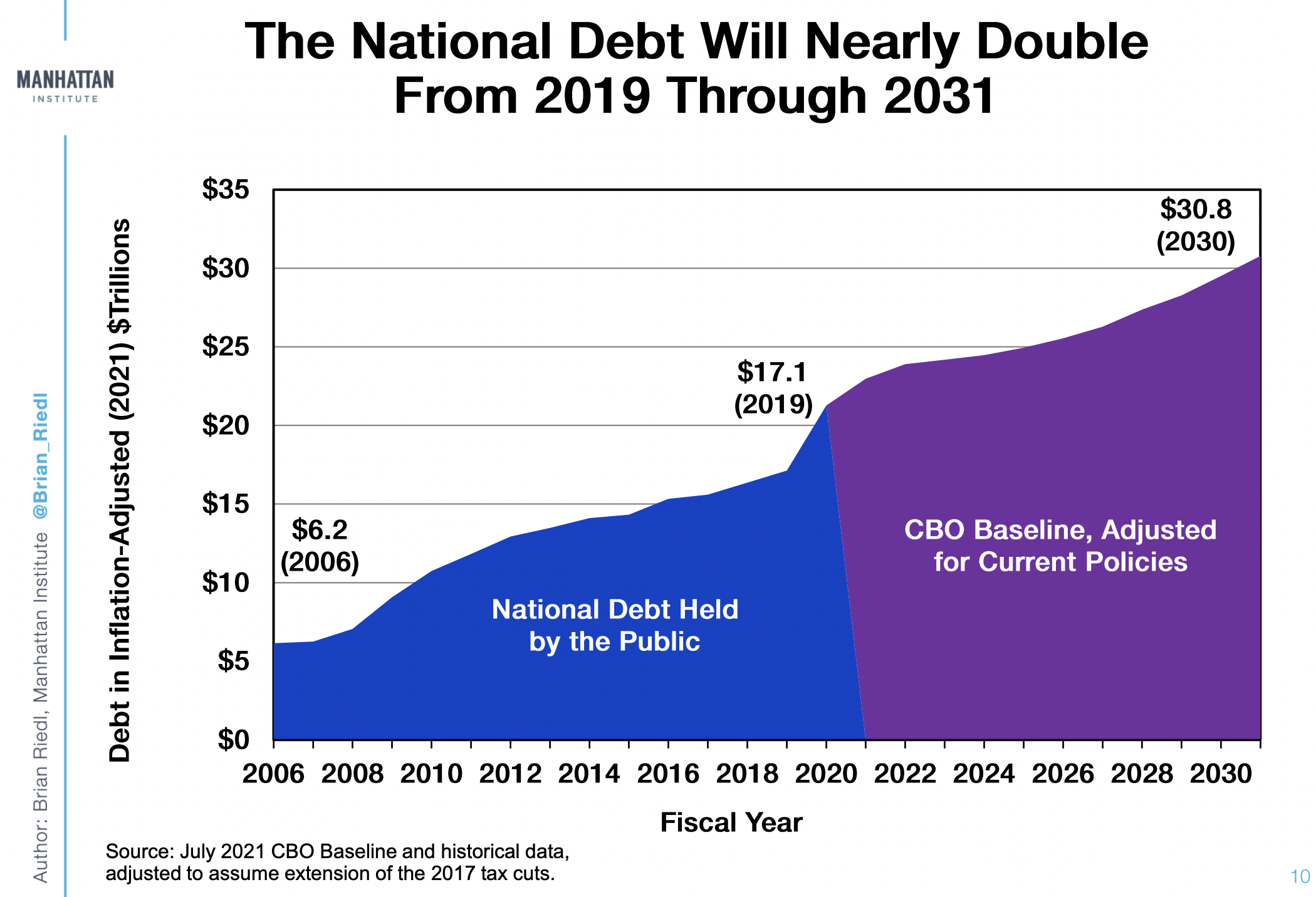 The Manhattan Institute’s Brian Riedl recently released his 2021 Chart Book, and it paints a devastating picture of the federal government’s finances. Here are 4 charts that show just how fast it is approaching budgetary disaster.
