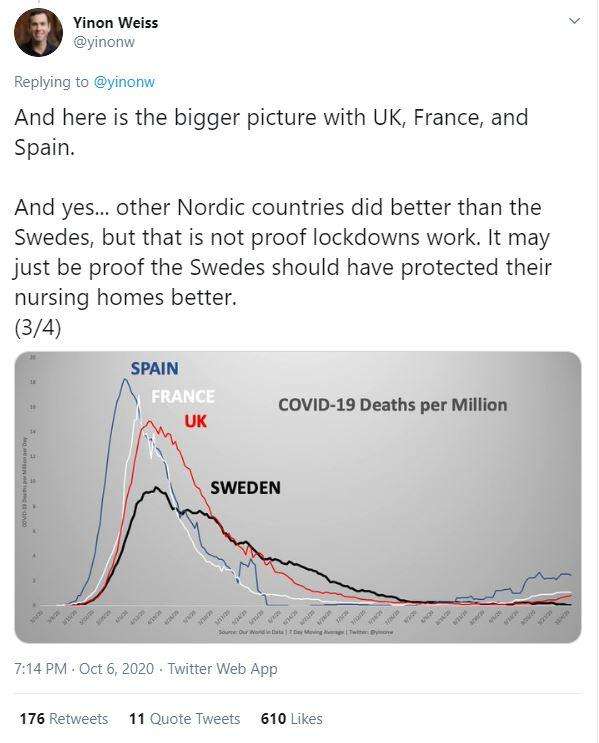 Yinon Weiss, a founder of RallyPoint and a Harvard Business School grad, has shown, Sweden’s current daily death rate is exponentially lower—25x, 10x, 7x—than many of its European counterparts that initiated strict lockdowns, such as Spain, the United Kingdom, and France.