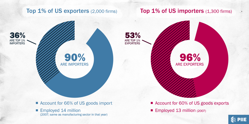 Many of the major multinational firms engage in considerable cross-border trade, meaning that they are both major importers and major exporters. Here’s a very illuminating chart from the Peterson Institute of International Economics.