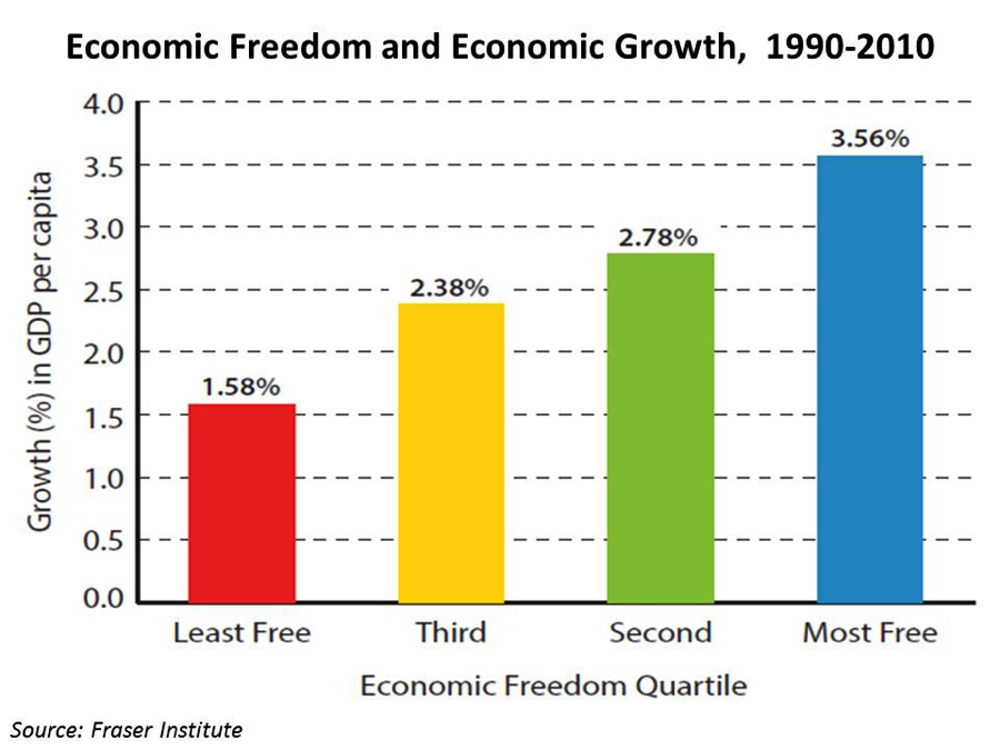 As the chart below shows, in the 20-year period between 1990 and 2010, the most economically free nations grew at rates more than double those of the least free nations.