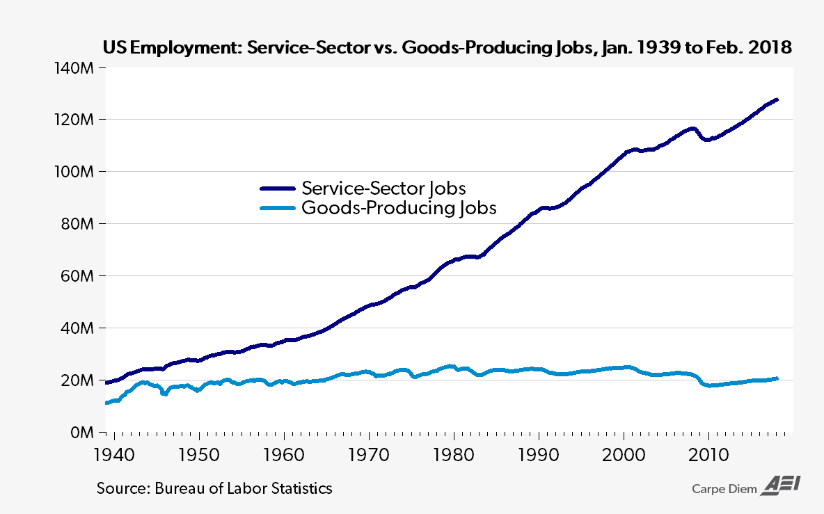 The chart below shows that the number of goods-producing jobs in the US has remained relatively flat since WWII at about 20 million, while the number of service-sector jobs has increased nearly seven-fold during that time period from fewer than 19 million in 1939 to nearly 128 million in February 2018. And yet, for several generations, we seem determined as a country to try to save or bring back manufacturing/factory jobs that never really existed at levels very far above today’s level for goods-producing employment. At the same time, there’s not much attention paid to promoting or celebrating the service sector, which is really America’s only job-creating sector that has added an average of 1.62 million jobs annually (81 million jobs in total) over the last half-century, while the goods-producing sector shed 1.8 million jobs.