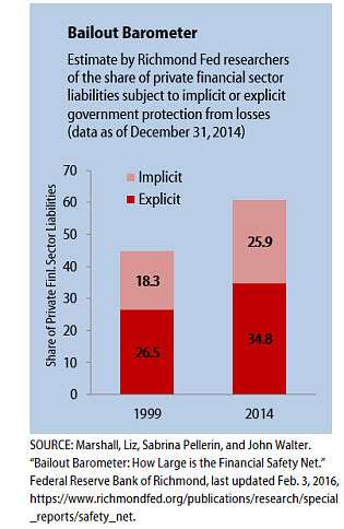 But other things have not remained equal. According to Liz Marshall, Sabrina Pellerin, and John Walter of the Richmond Federal Reserve Bank, the federal government is now protecting a much higher share of private financial sector liabilities than before the crisis: