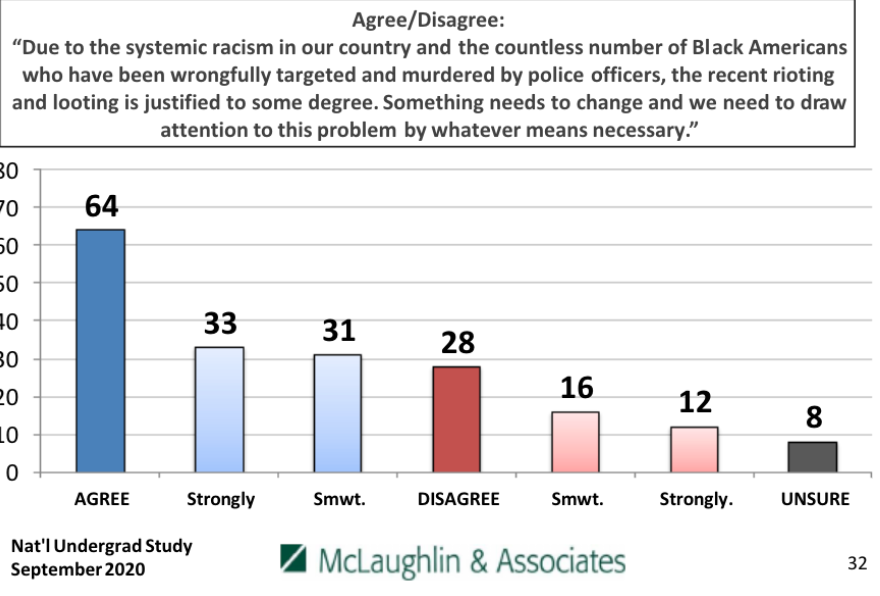 One key finding from the poll was that 64 percent of college students agreed that “the recent rioting and looting is justified to some degree.” Only 28 percent disagreed with this assessment.