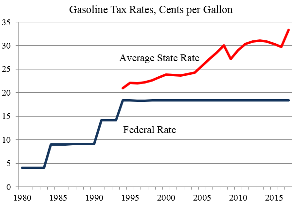 In today’s dollars, the real gas tax rate has risen substantially since the early 1980s.