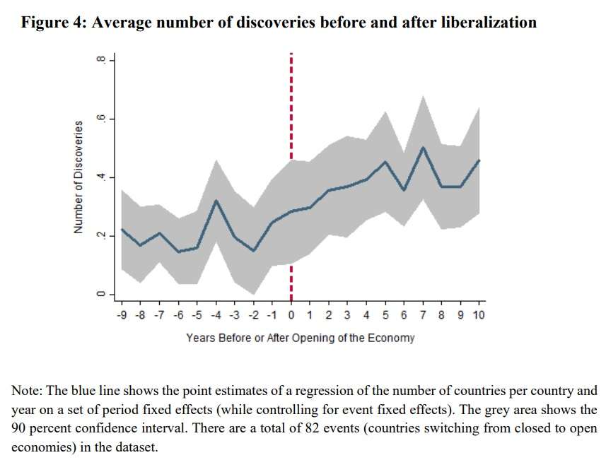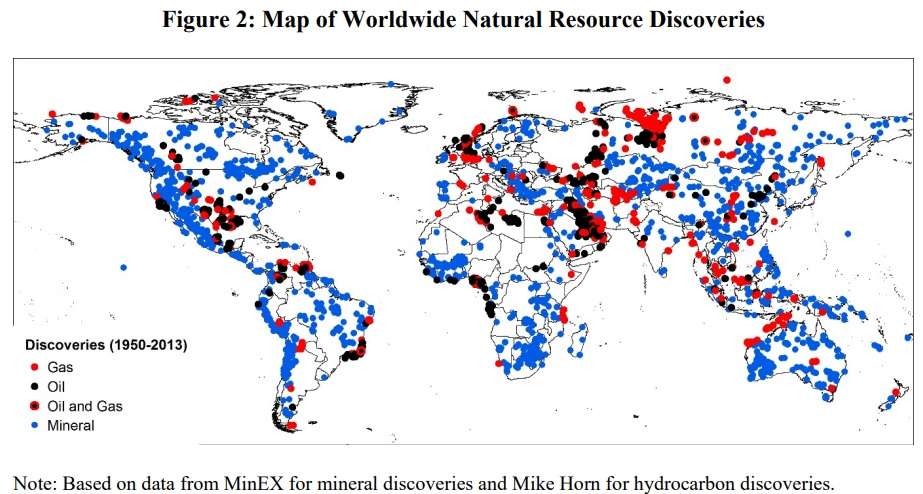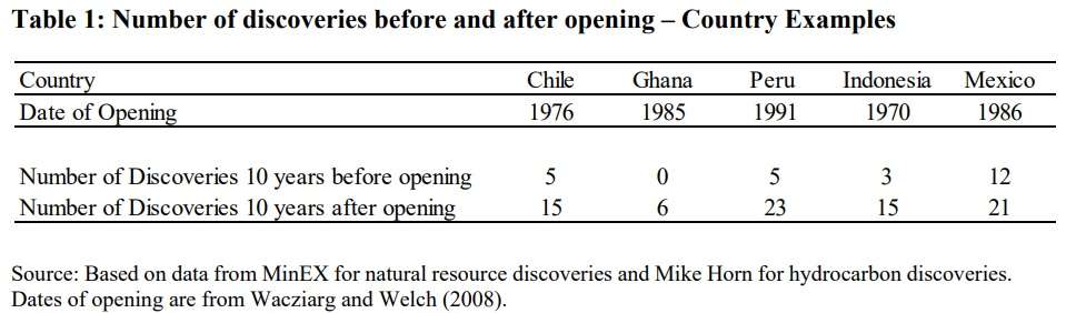 …our empirical analysis shows that market orientation causes a statistically and economically significant increase in natural resource discoveries. Our point estimates indicate that going from a closed to an open market orientation increases discoveries by 80-140 percent. …In a thought experiment whereby economies in Latin America and sub-Saharan Africa remained closed, they would have only achieved one quarter of the actual increase in discoveries they have experienced since the early 1990s.