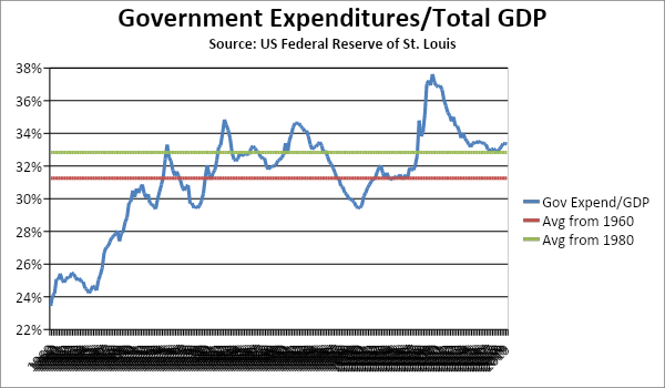 A quick glance shows that the size of government compared to the entire economy is currently well above the average since 1960 and even slightly above the average since 1980, the start of the “Reagan Revolution” which allegedly began the starvation. This is particularly impressive since we have been in a period of strong economic growth, when government expenditures typically fall (as they did in the mid-1990s).