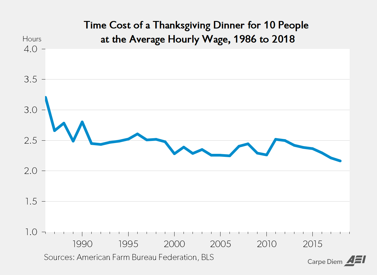 Bottom Line: The fact that a family in America can celebrate Thanksgiving with a classic turkey feast for less than $50 and at a “time cost” of only 2.14 hours of work at the average hourly wage for one person means that we really have a lot to be thankful for on Thanksgiving: an abundance of cheap, affordable food. The average worker would earn enough money before their lunch break on just one day to be able to afford the cost of a traditional Thanksgiving meal. Compared to 1986, the inflation-adjusted cost of a turkey dinner today is more than 25 percent cheaper, and 33.3 percent cheaper measured in the “time cost” for the average worker. Relative to our income and relative to the cost of food in the past, food in America is more affordable today than almost any time in history.