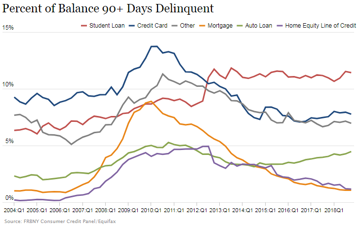 Worse, the percentage of student loan debt that is in “serious delinquency,” where no debt payments have been made for at least 90 days or longer, has remained stuck within a range between 10.7% and 11.8% of the total borrowed since 2012, the highest of all forms of household debt.