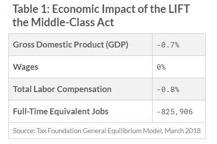 While the positive labor force effects of the phase-in of the credit could offset the negative effect of the phaseout, we find that, on net, the size of the total labor force would shrink under this policy. This is primarily due to the large number of taxpayers that would fall in the phaseout range of the credit relative to the number of individuals that would benefit from the phase-in. …We estimate that the credit…would reduce economic output by 0.7 percent and result in about 825,906 fewer full-time equivalent jobs.