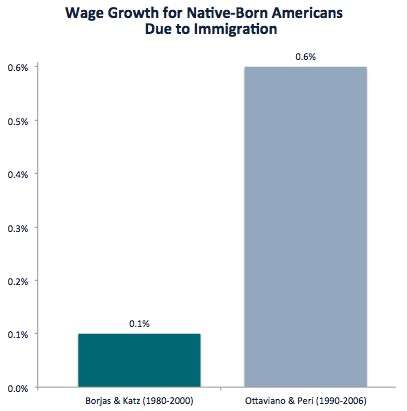 In addition to not being the “principal reason” for wage stagnation, immigrants aren’t any reason at all. As I pointed out in a paper last year, both economists who favor more immigration — notably Gianmarco Ottaviano of the London School of Economics and Giovanni Peri of the University of California at Davis — and those who don’t — most notably Harvard’s George Borjas — actually agree that immigration has increased average wages in the United States. The only real debate is over immigration’s short-term effect on wages for high school dropouts. Immigrants aren’t harming the “average family” at all.