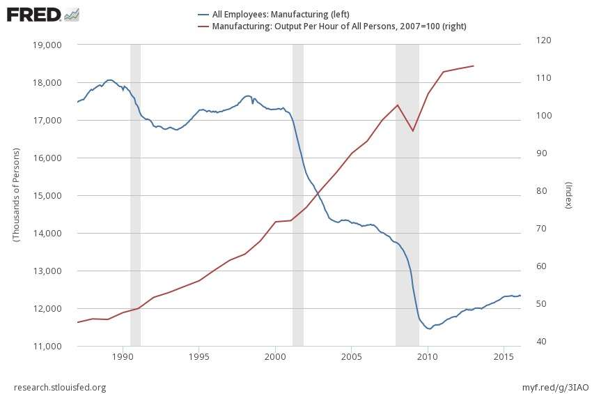 How can this be? Because manufacturing productivity — the amount of value added per hour worked — has gone up dramatically in recent decades. Manufacturing employment is declining because of automation; a US factory worker today can add a lot more value per hour than one in 1970.