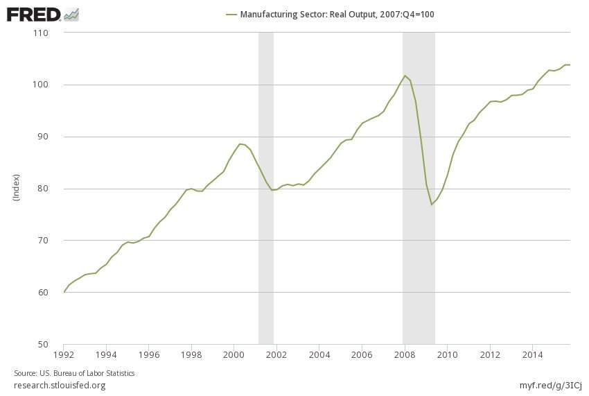 Real US manufacturing output is the highest it has ever been. Simply put, the US makes more stuff than ever.