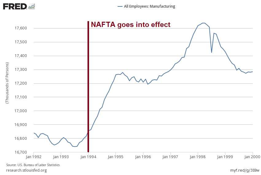 In fact, since NAFTA went into effect in 1994, total US employment has increased by 28 million jobs. Even if we buy the dubious claim that NAFTA “cost us 800,000 jobs” over the last 22 years, this amounts just 36,000 jobs a year.