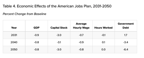 Of course, if capital—and hence productivity—is decreased, the opposite effect occurs and workers earn less over time. So, it’s not surprising that Wharton concluded the massive multi-trillion “jobs plan” will, by 2031, actually lead to a 0.7 percent decrease in average hourly wages. The analysts also note that there will be almost no increase in employment, as measured by total hours worked.