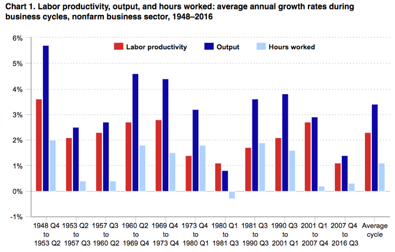 However, productivity gains have not yet been fully realized. In fact, this US business cycle has seen the lowest labor productivity grown since the 1948 post-war period began. This low rate signifies a struggle for our economy to increase the output produced for every hour we are working. It means our companies, government, and people must get by with less than if our society was growing more productively.