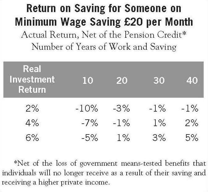 Real investment returns are low in Britain at the moment. A guaranteed return of only 2 percent can be achieved from index-linked government bonds. Returns might be higher from other investment instruments, but if we take the 2 percent figure, we see that the saver actually receives a negative return from investing in private pensions after the loss of means-tested benefits. Small savings by poor people are penalized the most.