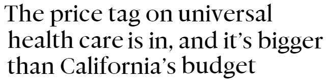 to create a so-called “single-payer” system, the analysis by the Senate Appropriations Committee found …Steep projected costs have derailed efforts over the past two decades to establish such a health care system in California. The cost is higher than the $180 billion in proposed general fund and special fund spending for the budget year beginning July 1.