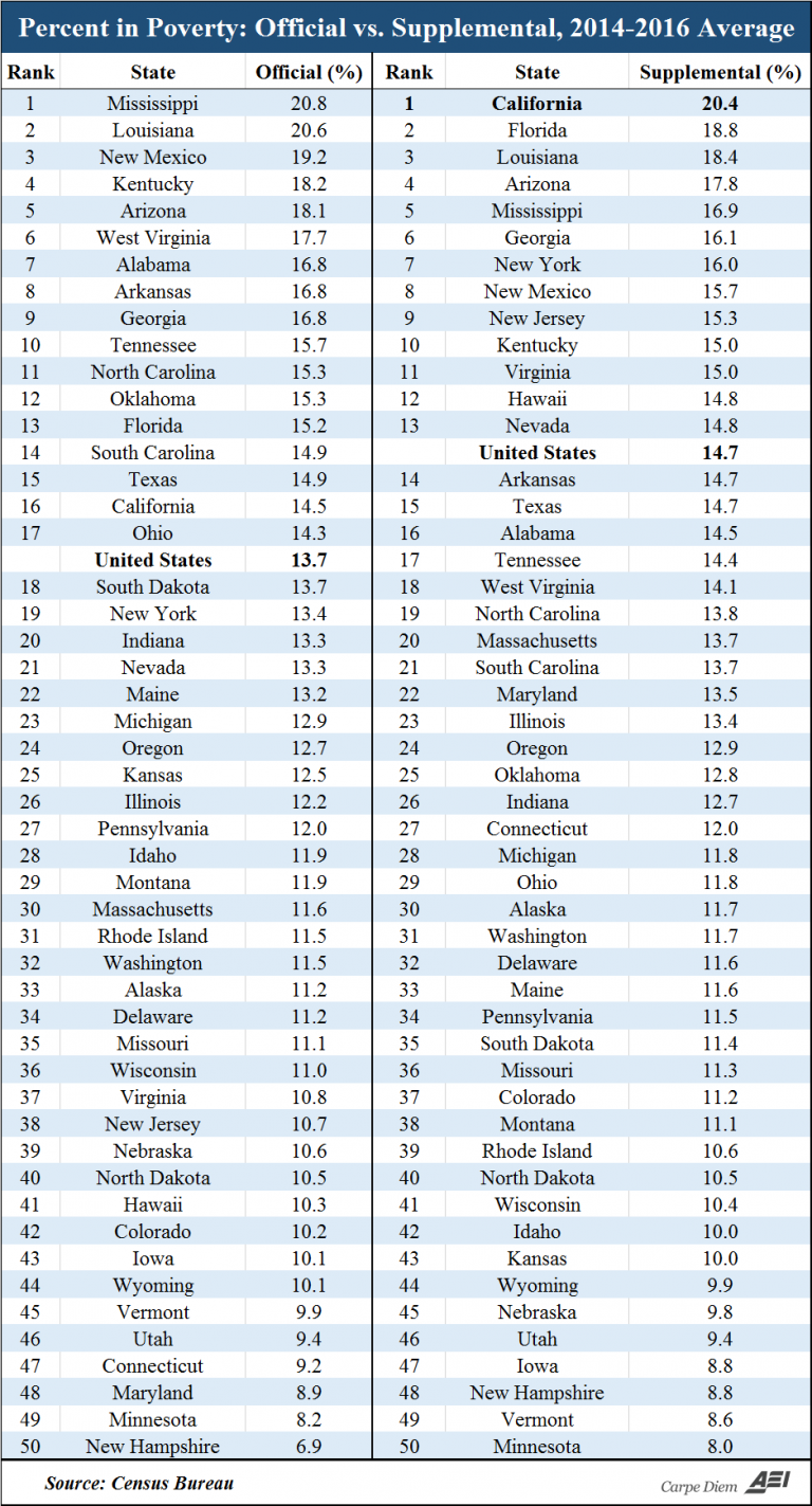 There are two different ways to measure poverty, you see. One accounts for cost-of-living in different states; one does not. The method that accounts for living costs (the Supplemental Poverty Measure) is more accurate, and it was introduced in 2011 by the U.S. Census.