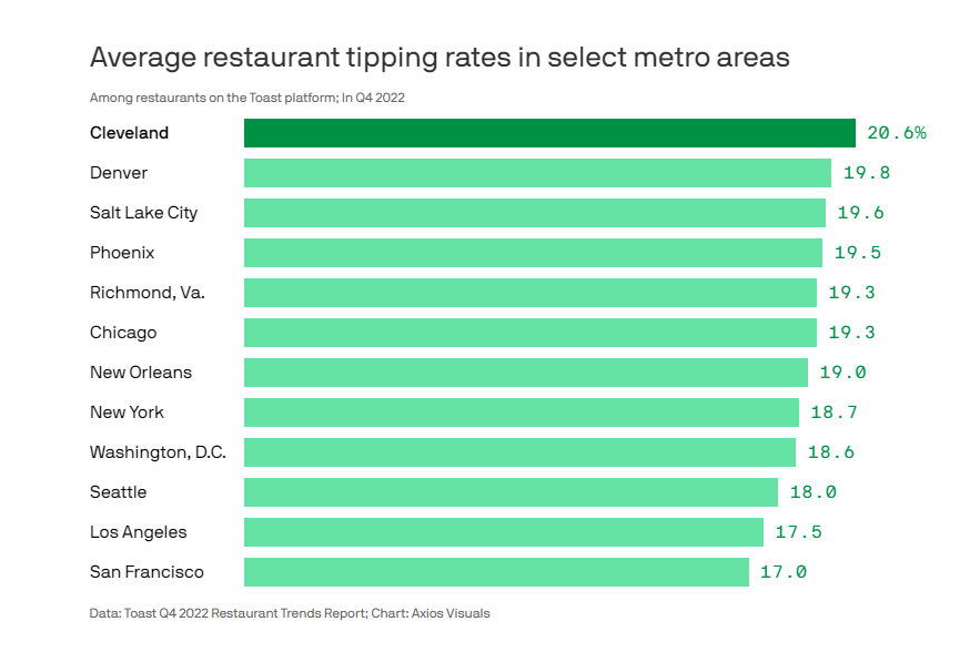 The survey, Toast’s Q4 2022 Restaurant Trends Report, breaks down tipping by state and major cities. The five most generous tipping cities of the twelve major metros analyzed were Cleveland (20.6%), Denver (19.8%), Salt Lake City (19.6%), Phoenix (19.5%), and Richmond (19.3%).