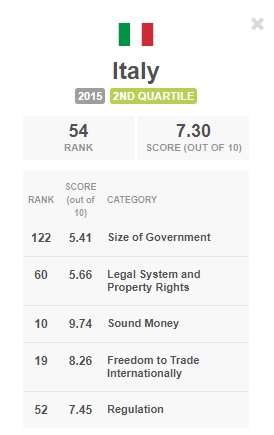 According to Economic Freedom of the World, Italy is ranked only 54th, the worst score in Western Europe other than Greece. The score for fiscal policy is abysmal, and regulatory policy and rule of law are also problem areas.