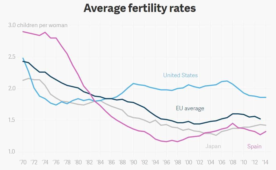 Europeans across the continent are having so many fewer babies that national populations from Scandinavia to the Mediterranean are skewing towards the older end of the spectrum, with not enough young, productive people to keep economies thriving and to look after the rest of the aging population. Spanish women have 1.3 children on average. In 2015, Spain’s death rate outstripped the birth rate… Edelmira Barreira Diz was appointed as “commissioner for the demographic challenge” last month.