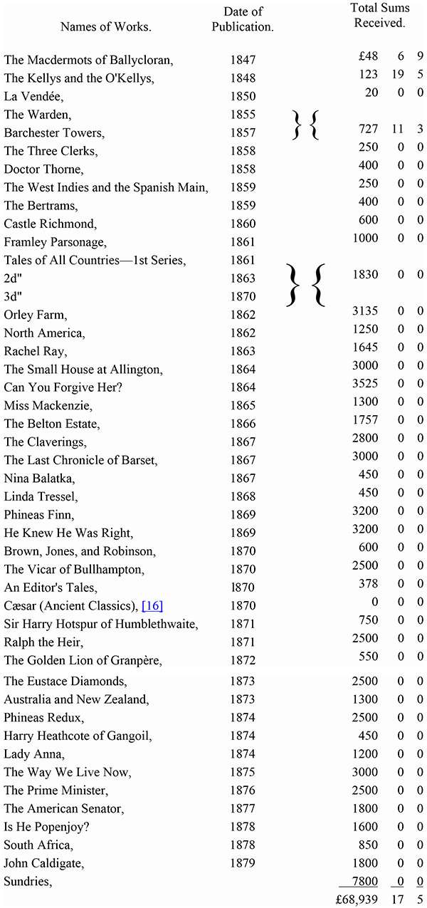The autobiography closes with the Victorian equivalent of a spreadsheet recording the titles of Trollope’s novels, their publication dates, and the amount he was paid for each one.