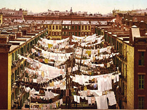 All of this makes those photographs of the New York clotheslines a little more interesting and a little less dreamy. Notice that the laundry drying in those pictures is nearly all underwear, petticoats, sheets, and other whites. Washing the darker outer layers of clothing would have been done less often, because of the great weight (especially when wet) and extended drying time. Remember that in days when most homes heated with coal, those whites wouldn’t have stayed white for very long as they hung in the smoky air.
