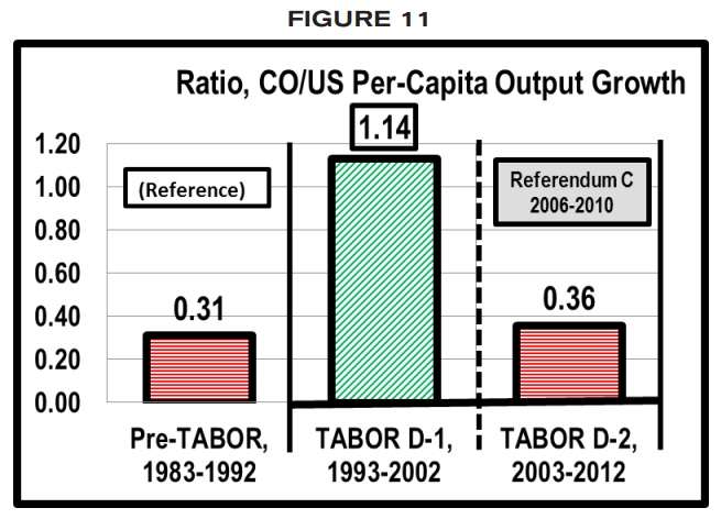 The Taxpayer’s Bill of Rights Amendment has worked well to achieve its stated intention to “slow government growth.” Although government has still continued to grow significantly faster than the rate of population-plus-inflation, the Taxpayer’s Bill of Rights did partially dampen excess government growth. …In terms of economic vitality, Colorado’s Decade-1 was best for Colorado. Unlike in the pre-TABOR decade, or in TABOR Decade-2 with its record increase in taxes and spending, because of Referendum C. Colorado’s first TABOR decade saw the state economy far outperform the national economy.