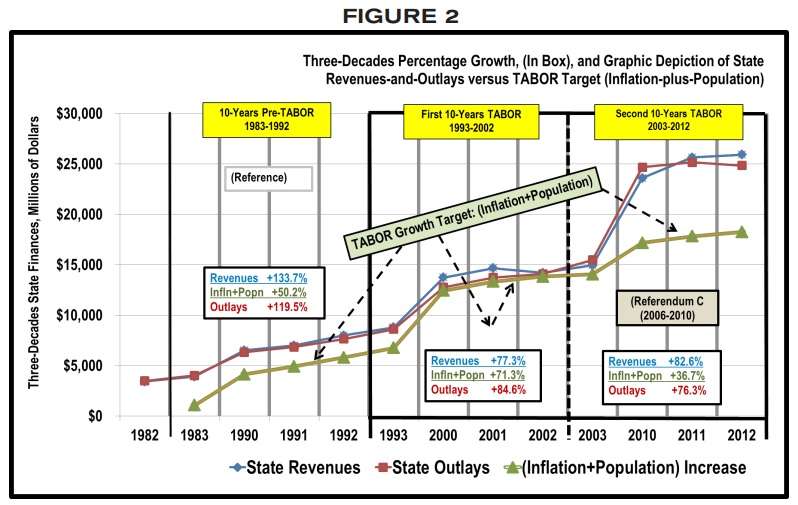 Colorado voters adopted The Taxpayer’s Bill of Rights in 1992. TABOR allows government spending to grow each year at the rate of inflation-plus-population. Government can increase faster whenever voters consent. Likewise, tax rates can be increased whenever voters consent. …The Taxpayer’s Bill of Rights requires that excess government revenues be refunded to taxpayers, unless taxpayers vote to let the government keep the revenue.