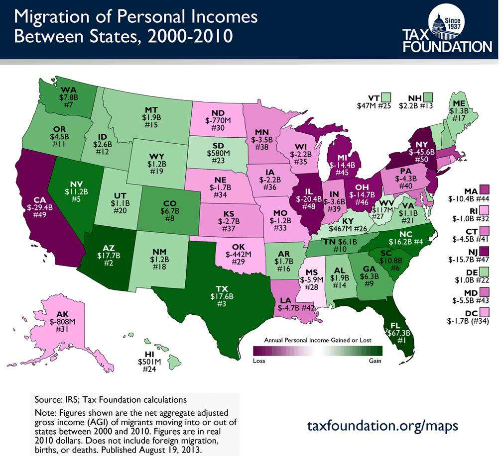 … the tax hikes have been a disaster. A net 30,000 residents moved to other states last year. Since 2010 seven of Connecticut’s eight counties have lost population, and the hedge-fund haven of Fairfield County shrank for the first time last year. In the last five years, 27,400 Connecticut residents have moved to Florida … More than 3,000 Connecticut residents have moved to zero income-tax New Hampshire in the last two years. While liberals wax apocalyptic about Kansas’s tax cuts, the Prairie State has welcomed 1,430 Connecticut refugees since 2011 and reversed the outflow between 2005 and 2009. Yet liberals deny that tax policies influence personal or business decisions.