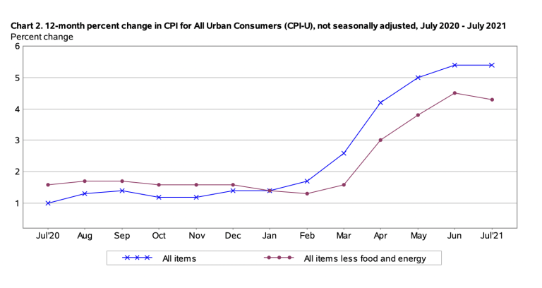 The Labor Department just released the Consumer Price Index (CPI) for July, an imperfect but still useful tool that measures price changes in a bundle of typical consumer goods. It shows that prices increased 0.5 percent from June to July, which is an annualized rate of consumer price inflation of 5.4 percent. Some goods saw particularly acute price increases in July, such as energy, food, housing, used cars, and other essentials.