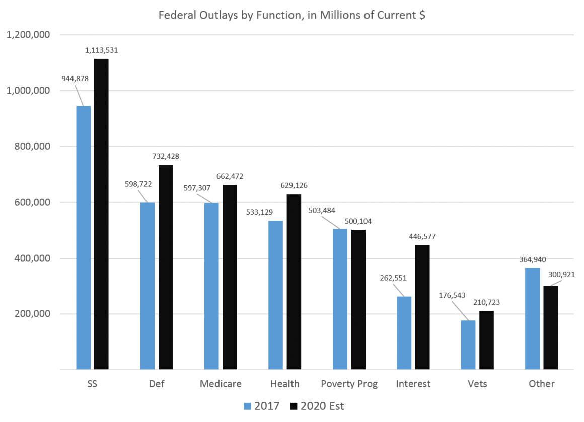 The OMB’s projections show debt payment outlays growing a startling 70 percent from 2017 to 2020. The sector with the next-highest growth rate is defense, but that increases by only 20 percent over the same period: