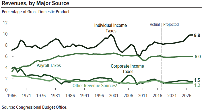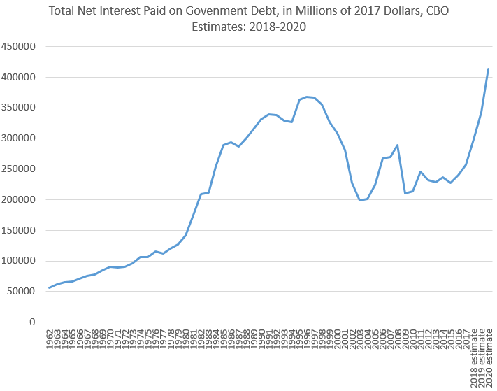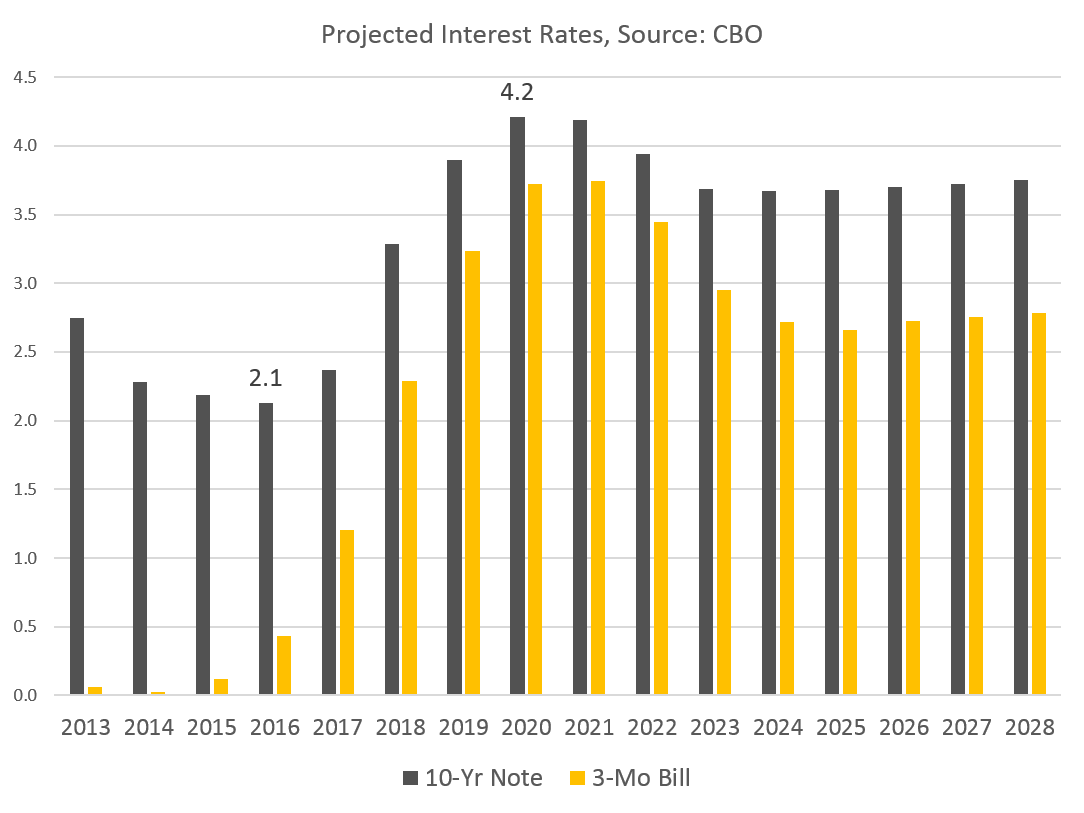 And it won’t be a surprise as interest rates increase and debt payments get larger. Indeed, the CBO expects the interest rate on the 10-year Treasury note to increase 4.2 percent in 2020. It moderates after that but never returns to the sorts of very low rates we’ve seen in recent years.