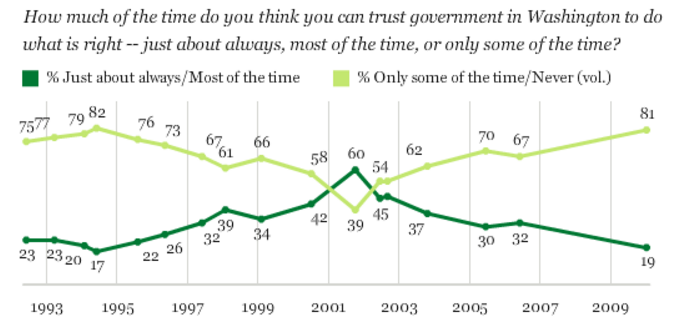 In international affairs, trust in government has never been lower. It is remarkable to think that even during the Vietnam era of mass protests and draft riots, overall trust in the government to manage foreign affairs was 74%. It’s been one long slide since then. Today, trust is a dismal 45%. And matters are even worse on domestic matters. At the start of Nixon’s second term in 1972, 70% of those surveyed trusted their government (if you can believe it). Today, it is 38%. No poll in the Nixon era, even after Watergate, has ever seen the domestic trust level dip into the 30s.