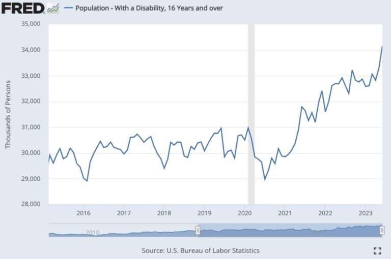 In January 2021, there were 29,851,000 disability claims. By June 2023, that figure had reached 34,152,000 — an increase of 15% in just 30 months, the fastest increase on record. (Data go back to 2008.)