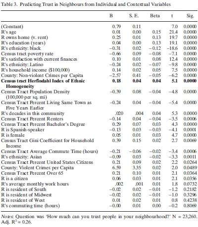 [T]he diverse communities in our study are clearly distinctive in many other ways apart from their ethnic composition. Diverse communities tend to be larger, more mobile, less egalitarian, more crime-ridden and so on. Moreover, individuals who live in ethnically diverse places are different in many ways from people who live in homogeneous areas. They tend to be poorer, less educated, less likely to own their home, less likely to speak English and so on. In order to exclude the possibility that the seeming ‘effect’ of diversity is spurious, we must control, statistically speaking, for many other factors.