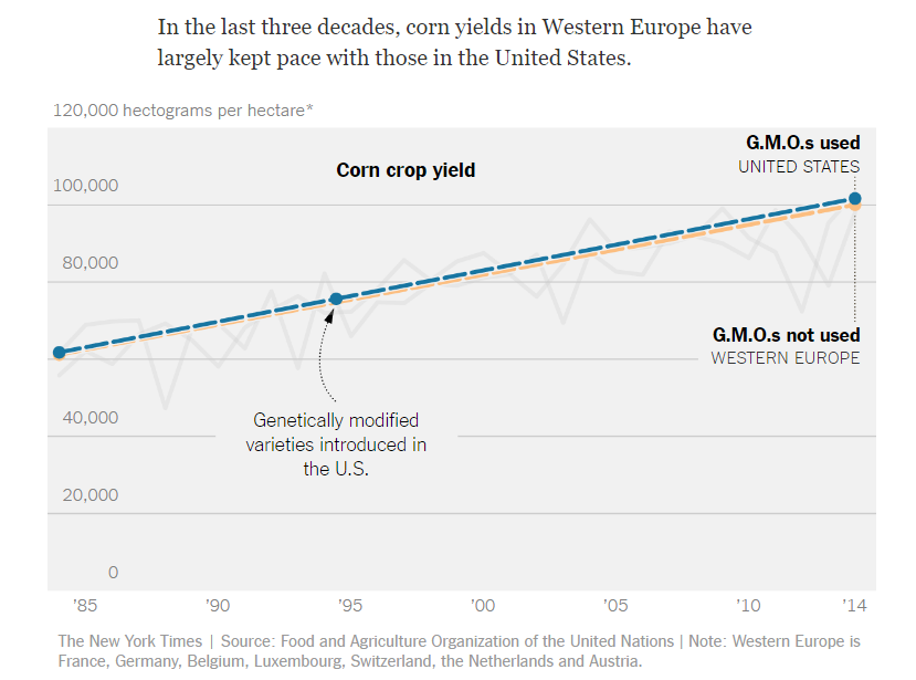 Here’s one graph showing corn crop yields in the United States, which uses GMOs, and Western Europe which does not. See the difference?