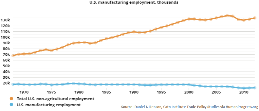 Despite growing revenues and output, manufacturing employs fewer Americans than it once did. Technological advancement has led to gains in efficiency, and it is primarily automation, not trade, that has reduced demand for workers in manufacturing.