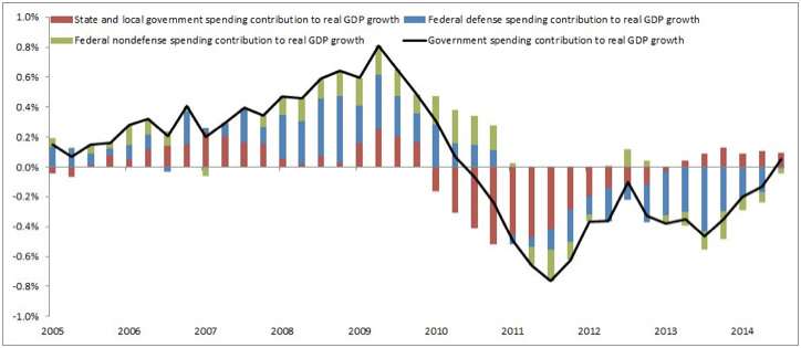 Look carefully at the legend. The various colored rectangles are different components of government spending. Specifically, the rectangles indicate how the change in each component — positive or negative — relates to the change in overall GDP. The black line is not GDP growth, but is instead the sum of the various components of government spending. In short, Matt Klein at the FT is telling us that if we take the BEA’s word for how much each component of government spending contributed to GDP growth in each quarter, then we can stack those numbers on top of each other and even add them up! Contrary to Edwards, the FT chart doesn’t “show” anything at all, except that the BEA each quarter announces how much various components of government spending contributed to, or subtracted from, GDP growth.
