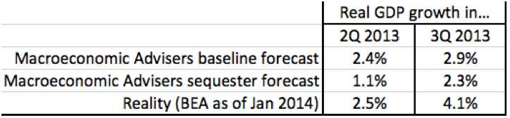 The exact opposite happened with the so-called sequester. For example, the firm Macroeconomic Advisers, using a Keynesian model, predicted that the spending cuts would knock 1.3 percentage points off of second quarter 2013 growth, and 0.6 percentage points off of third quarter 2013 growth. Here’s what really happened: