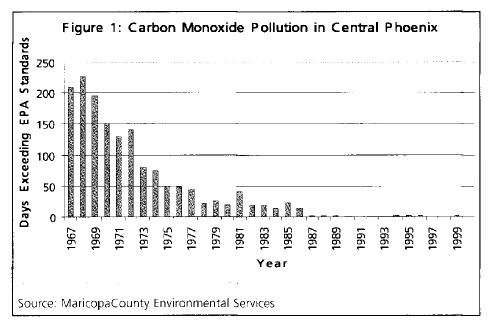 Although it may not be widely known, urban air quality has been improving over the last few decades despite a dramatic increase in VMT. Taking carbon monoxide as an example, in Phoenix, violations of the Environmental Protection Agency standards used to be common everyday events. Now violations are rare (figure 1.)