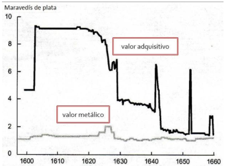 Purchasing power of the billon cuarto coin reverting to the market value of copper, 1597-1659. The maravedí was one of the era’s units of account. Source: Federal Reserve Bank of Chicago.